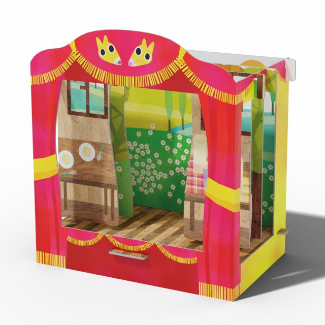 Contenuto: 1 teatrino in cartone, 3 fondali double-face, 8 quinte laterali double-face, 12 personaggi double-face, 12 stecche d’animazione, guida didattica.